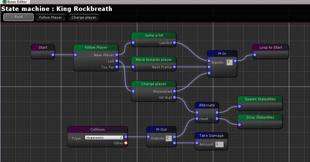 Clumsy Bat involves periodic boss encounters with pseudo-scripted behaviour. Inspired by the Unreal Engine 4 Blueprint system, the node-based AI editor was built from scratch using the Unity Editor API.