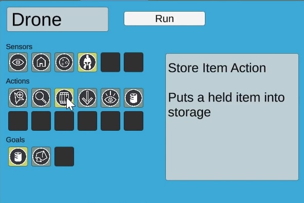 The video below shows an implementation of GOAP where it wants to collect resources, while keeping itself fuelled. It will prioritise fuel when the supply runs low, retrieving coal instead of gathering resources. Otherwise it will collect resources if it can find any, and return them to the storage depot.