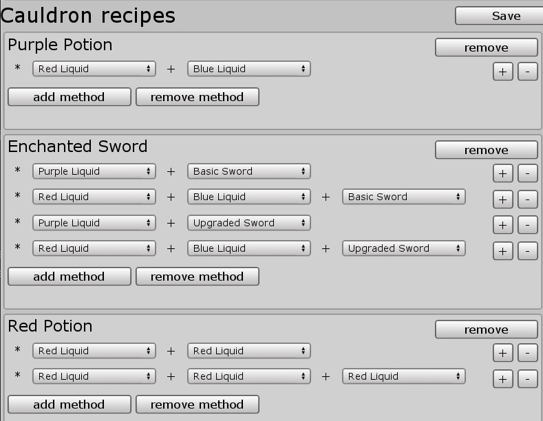 The recipe editor manages how objects can be combined at each individual crafting station. Each station can have its own unique set of recipes, all configurable without code changes. This gave the design team direct control over the crafting system's rules and balance.