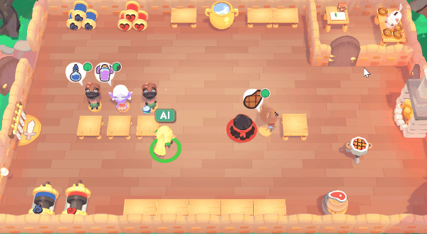 In the example shown, a player delegates the helper AI to cook a steak for a customer. The player interrupts the cooking process, and the AI immediately corrects this by cooking another steak. Before it finishes, the AI is instructed to defend the inn — it promptly fetches a weapon and attacks the monster.